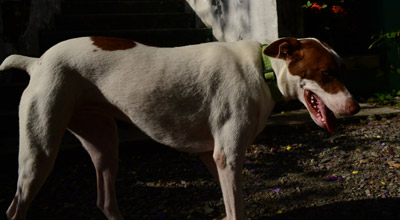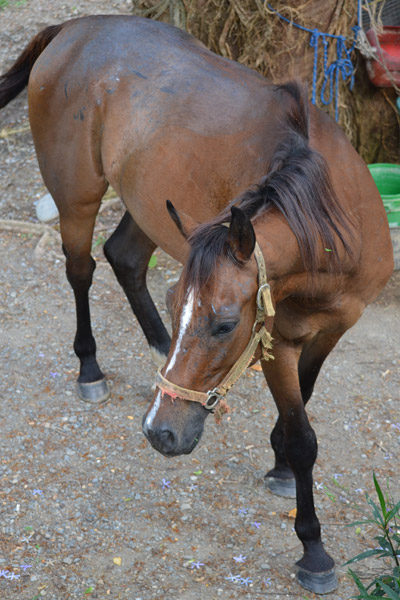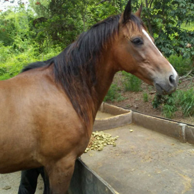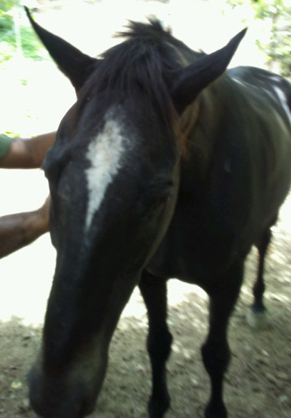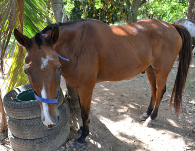 We will not give them away or take them to the Animal Shelter to have them euthanized, but we can use financial help in feeding, providing medicine and care for our numerous animals. They've got an excellent place to live. Most all our horses were rescued/adopted. All came with medical problems or flaws, and were basically given to us for $1 and a good home. It is the year round maintenance that is difficult to stretch the cash flow through the fall which is the rainy and hurricane season and off-season for vacationer tourists. The larger, thoroughbred type horses needed to carry larger riders need double the feed and maintenance of the island crossbreeds. As everything has to be shipped to the island, the cost of horse feed, dog and cat food, medicine are exorbitant by mainland United States standards. Rather than take cats and dogs to the pound where they know they will be euthanized, frequently some local islanders decide to abandon their extra unwanted, injured, or malnourished pets in our area knowing that we take care of our animals and they might wander up to our property and find a good home. Being animal lovers, we have thus taken in on average one dog or cat a year for the past twenty years without a choice in the matter. However, with the high costs of feeding and taking care of these animals, we have a hard time keeping up with these costs, and greatly appreciate those with the means to provide assistance in support of our animals. To donate, pick any day below (it doesn't matter).  Please IGNORE the references to "Book Now," "Book online now" and "reservation"  -- this is a hard coded description by Fareharbor that could not be modified. "Butch" Brown bay gelding with a white streak.  A tall slim frame ex-race horse from the States, Butch was brought to St. Croix as a 12 year old to compete against 2 year olds.  When he didn't win, his owners decided to sell him to us, and after a year he became an excellent riding horse until he was wounded.  A trespassing deer hunter stupidly shot Butch in the chest when he saw Butch's eyes reflect at night.  We've had Butch on several different antibiotics and his injury heals but reopens with drainage. Butch is in need of donations for surgery to remove the bullet that plagues him, and he cannot be ridden until he is treated.  Donations towards his surgery or additional antibiotics would be a great step towards getting this excellent riding horse back to 100%. "Wally" Beautiful stout ex-racehorse about 10 years old, we acquired Wally with two bowed tendons and he reinjuries himself when the weather conditions become very rainy and slippery in his paddock.  He is mostly a beautiful pet to pour dollars of feed into. "Genip" Large black-brown ex-racehorse with a white diamond marking on his forehead, we should have renamed Black Beauty.  He has recurring old racing injuries that lame him up when its wet and muddy. Genip shares his pasture with Frits and both are plagued with reocurring thrush or foot rot during the rainy season.  The structure of their heels and frogs of their feet are conducive to aggravating the situation.  The product "New Foot for Fussy Eaters" is pelleted and cures them from inside out but a single container is a very expensive $75 plus shipping. "Frits" Frits is our largest horse at 17 hands, he's a chestnut gelding with a big white blaze.  Frits is one our best and easiest horses for larger riders, but he has on-and-off lameness and Asthma during rainy season. "Polar" Newest addition for 2017, a 2 year old unneutered male dog we named "Polar", a white cream half breed German Shepard slim dog arrived in April scared of people.  He was very bony and whole coat was full of mange, now slowly improving.  He was abandoned on the beach, and wandered up in our area as an emaciated starving wild dog no one could get near. Jill set up a feeding spot at the edge of our property as our dogs would run him off if he came into their yard. By May, eventually, we assimalated him with our other dogs, and were able to approach him while he was fraternizing with our other dogs and put a collar on him.  He fought and bit at the leash at first but eventually submitted to a shampoo and mange dip when he realized Jill was not going to hurt him.  He has since fit in nicely with the other dogs, and is no longer scared of people. Polar needs neutering, more mange treatments, Heart wormer, and regular wormer. "Orangie" and "Darkie" "Darkie", 1 year, an interesting pattern of leopard spots over dark charcoal gray with black horizontial stripes.  He's now tame enough to pet. "Orangie", an unneutered male wild stray orange tiger about 2 years comes and goes, very lean, needs wormer and does not get close enough to pet.  He has been touched a couple times when he's distracted by interacting with our other cats, but runs away from humans.  With time, he will be tamed and once neutered he will stay around and gain weight instead of wandering looking for females. "Buddy" #1 customer greeter -- Very friendly, Buddy hastily races to arriving cars to be the first to greet the customers, almost getting run over in the process.  Please be careful when parking. Buddy is our oldest dog.  10 years ago he arrived as a starving mangy puppy with no hair.  He is now a sleek and overweight from sneaking into the horse feed and living in the house.  He is not a "regular" dog.  As a pitbull mix, we had him neutered at a very young age so he wouldn't develop hany fighting instinct.  He does however, hate land crabs and is a proficient hunter of them when they wander near our house after heavy rains.  Buddy loves people and being a house dog.  He has developed cancerous growths on his skin that need operations to remove. "Ringleader" and "Shadow" A wild and skinny pregnant female dog showed up in 2010 and had her puppies in the neighboring pasture alongside the trail ride route.  We rescued and tamed the puppies, one red orance and one black. "Ringleader" is the red-o