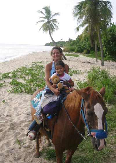 We will be arriving by cruise ship just for the day. How do we make reservations, at what time, and how do we get there? Where are you located? Do I need a U.S. Passport to get to St. Croix? Do we need reservations, and how do we arrange transportation? What is the price of the ride, and how long is it? Can you accommodate an experienced rider and their spouse who has never ridden? Will I have difficulty getting on the horse? The horses don't just walk the whole way, do they? What type of scenery do we see, and what's the tour about? Can we bring along cameras? What type of saddles do you have? What type of attire should riders wear? Where can I get a hold of your brochure? Why do you have so many animals and how do you support all of them? Q: We will be arriving by cruise ship just for the day. How do we make reservations, at what time, and how do we get there? We suggest making reservations at least two weeks in advance. CALL 340-332-0417. WE ARE CLOSED ON WEEKENDS AND HOLIDAYS. To make a reservation, we must have each riders NAME, HEIGHT, and truthful vacation WEIGHT (most important), riding EXPERIENCE and AGE. Please include your phone numbers, as we may choose to respond by phone. Also mention the date you leave for your trip. We require a credit card number to reserve your reservation, and for your security please phone in your credit card info, instead of transmitting it via e-mail. You can, however, the other necessary information. Cruise ship passengers usually need to go on our late MORNING ride, as the afternoon ride gets back too late to get back to the ship. On cruise ship days, if the morning ride is full and there is sufficient demand, we may open up an additional mid-day ride. Q:    Where are you located? Where is St. Croix? We are vacationing on St. Thomas and found out that their stable went out of business. We are located just 40 miles south of St. Thomas, within the chain of Caribbean islands. Follow this link to our map. Our stable is located 1.5 miles north of Frederiksted, at Estate Sprat Hall, off Rt.58; just 5 minutes by taxi from the Frederiksted cruise ship pier. We are a three minute walk from Sprat Hall Plantation, and/or Sprat Hall Beach. We are 45 minutes from Christiansted, and one hour from East End. From St.Thomas, it's a 90 minute ferry ride to Gallows Bay dock, then a 45 minute taxi ride to our location. A sea plane from St.Thomas takes half an hour and then a half hour taxi trip to our stable. Q:    Do I need a U.S. Passport to get to st. Croix? No, for U.S. Citizens, no passport is required to travel to the U.S. Virgin Islands. Q:    We are vacationing on St. Croix. Do we need reservations, and how do we arrange transportation? Yes, you need a confirmed reservation. We recommend at least a day or two in advance. You can hire a taxi, or rent a car for the day, for about the same price. You can use the maps found in "St. Croix-this-Week" and "St. Croix Explorer" tourist guides to find our location on the tropical west end. Look for bold print of Rain Forest on the map of St. Croix. Q:    What is the price of the ride, and how long is it? The price is $150.00 per person. We do NOT take credit cards directly for payment, but we require a credit card only to hold your reservation and to guarantee your arrival. You can reserve and pay online via credit card using the 'Book your ride' links to the Fare Harbor service.  We require at least 24 hours advance notice for cancellation, otherwise you may be charged a cancellation fee. When you arrive at our location, if you have not already paid via Fare Harbor, you must pay with either cash or travelers checks. Q:    Can you accommodate an experienced rider and their spouse who has never ridden? Yes, we can accommodate mixed groups. There is no problem for beginners, as our horses have auto-pilot features. What we need to know is, whether the beginner rider is timid or adventurous and wants a slower horse, or a more frisky horse. We try to schedule experienced riders, when there are no kids on that ride. Q:    Will I have difficulty getting on the horse? We have a three-step stepstool to make climbing aboard a little less difficult. Q:    The horses don't just walk the whole way, do they? Certainly not! With average weight riders, we usually have several opportunities to canter (run). If we have heavy riders and/or small kids, the rides are walk/trot.  Q:    What type of scenery do we see, and what's the tour about? You will see a variety of different types of scenery on the four mile trek. In the rain forest valley, Jill will introduce medicinal plants and their cures, Tarzan vines, wild bromeliads, huge termite nests, and perhaps green and black zebra butterflies, or a mongoose. Interesting trees with different uses are pointed out, such as the Tamarind and Mango for steak sauce and chutney, Kapok or Silk Cotton for stuffing life jackets, and the Turpentine tree, nicknamed the "tourist tree". The country pasture lands are filled with majestic old Rain Trees, whose umbrella shaped canopies reach down to the ground. Along the way, Jill mentions a bit of island history. Q:    Can we bring along cameras? Sure. We have saddle bags on each saddle that accommodate the light weight modern cameras. We do not recommend the heavier old-fashioned type, as they have a tendency to bounce around in the saddle bags in the faster gaits, or bang the riders ribs. Q:    What type of saddles do you have? We have only Western saddles, as that style has a saddle horn that beginners can hold onto for security, enabling them to learn to canter. We have different sized saddles that can accommodate up to a 6'5", 230 lb. man, down to a 5 year old's size. We have an assortment of kid sized saddles. Experienced English saddle riders can do the posting trot in the Western saddle. Q:    What type of attire should riders wear? We recommend wearing jeans or long pants. We can outfit riders with long p