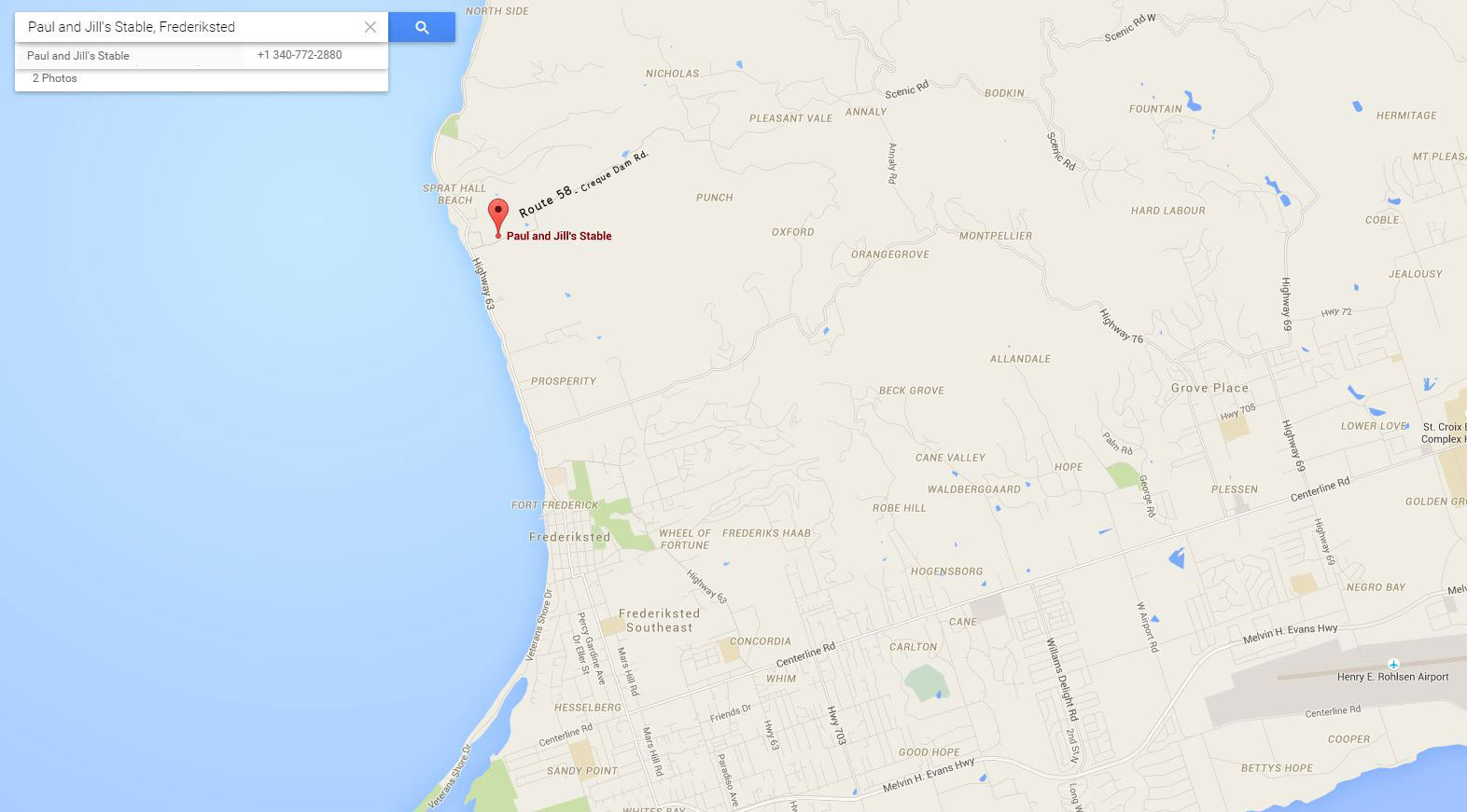 Coming from St.Thomas, it's a 90 minute ferry ride to St. Croix, then a 45 minute taxi ride to our location. A sea plane from St. Thomas takes half-an-hour and then a half-hour taxi trip to our stable.